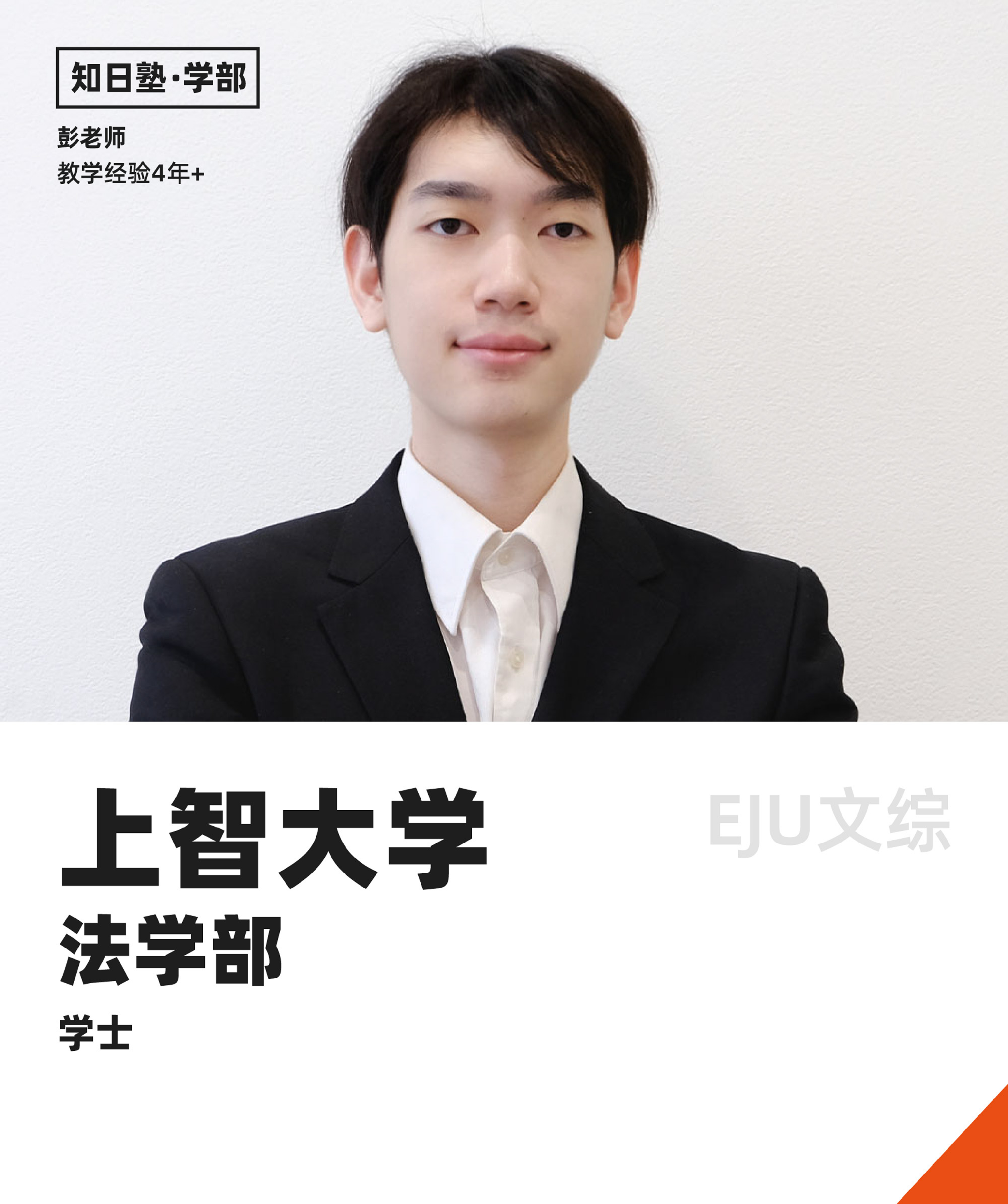 彭先生は上智大学法学研究科を卒業しました。彭先生自身は私塾を利用せず、独学でEJUの文科総合試験に2度挑戦し、195点と196点という優れた成績を収めました。彼は学生がEJUを学習・準備する際の疑問や困難を深く理解しており、そのため、学生に全方位的なサポートを提供しています。